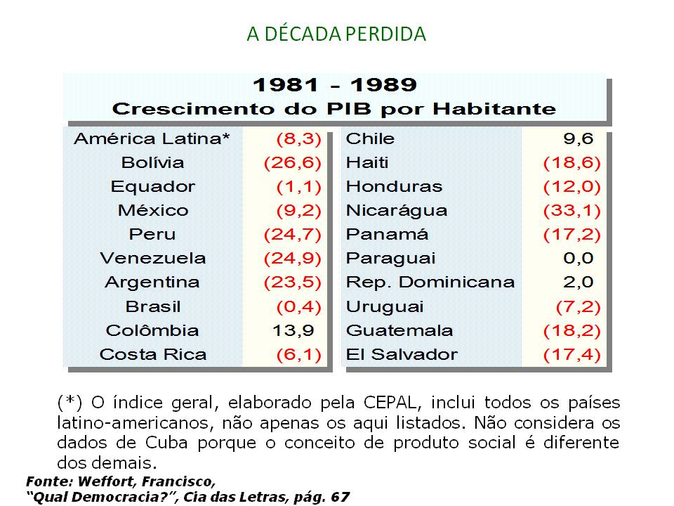 O Brasil, assim como quase toda a América Latina, passou por um período complicado que se tornou conhecido como “década perdida”. Nesse período, refletido na tabela 1, apenas três países da região tiveram desempenho positivo: República Dominicana, Chile e Colômbia.